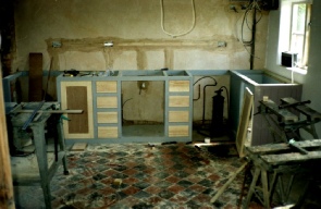 The picture on the right shows the new Kitchen being built, on site. The cupboards and drawers were carefully constructed to a slightly smaller sizing than standard kitchens, allowing a full range of kitchen utilities to be fitted.