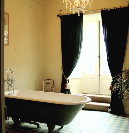 Pictured left is the re-modelled bathroom with new patio doors and period styled tiled floor. Superior fittings and a cast iron bath give this new room a beautiful and luxurious edge. Custom joinery finishes the period feel.